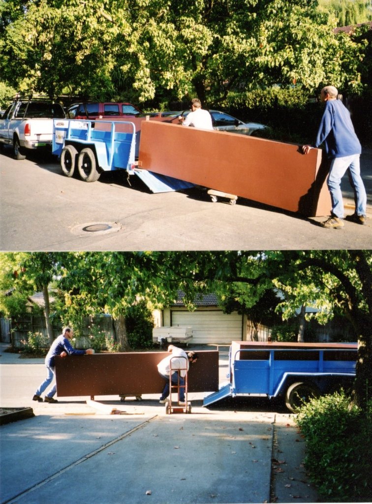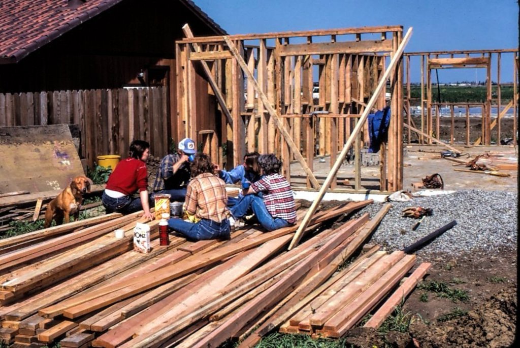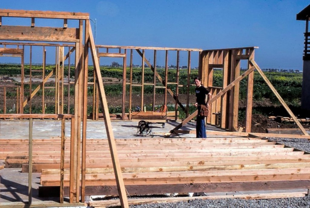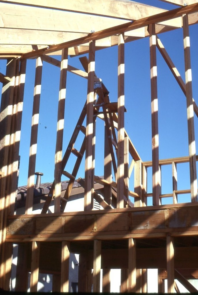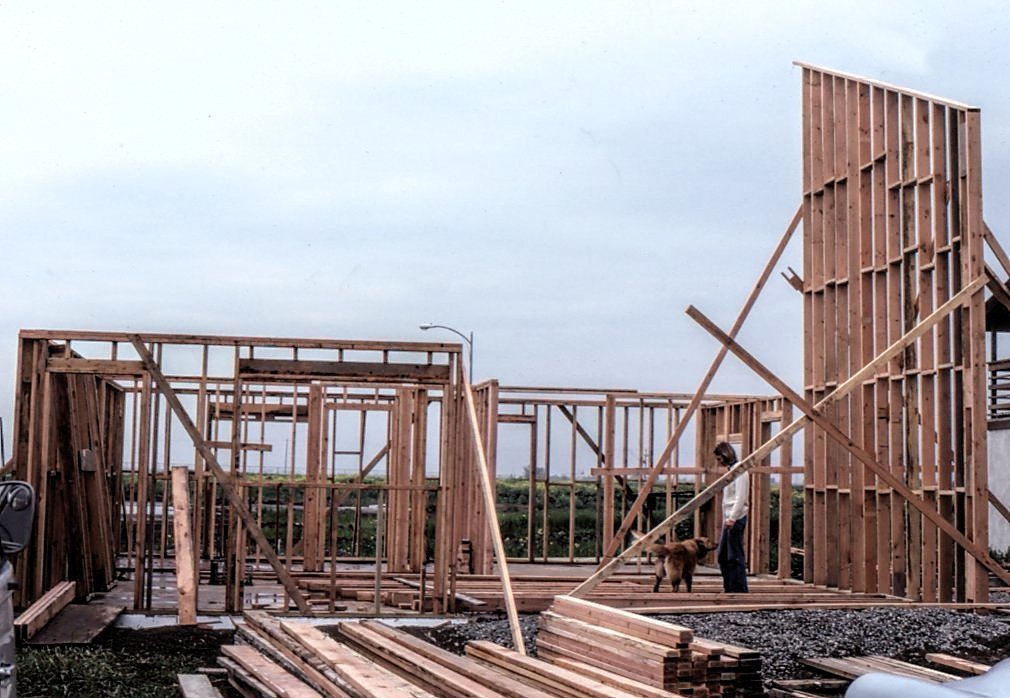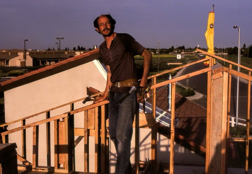 Reed nailing off loft beam. Left background; Emerson Jr High, Right; Calaveras Ave.