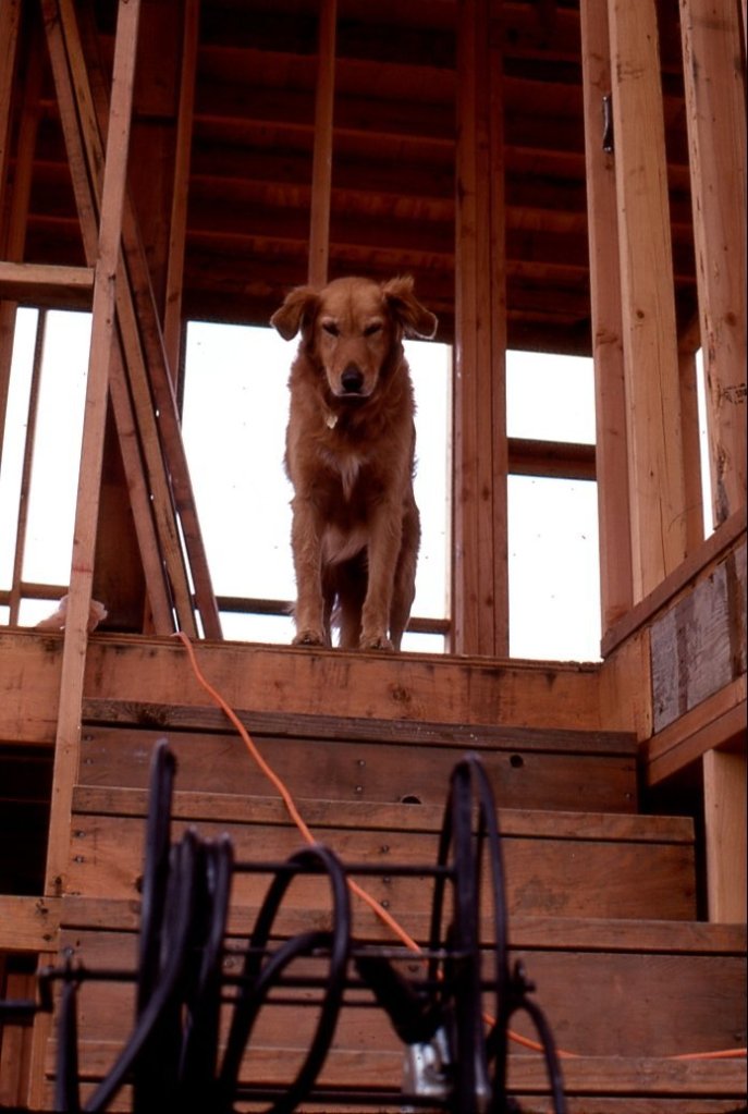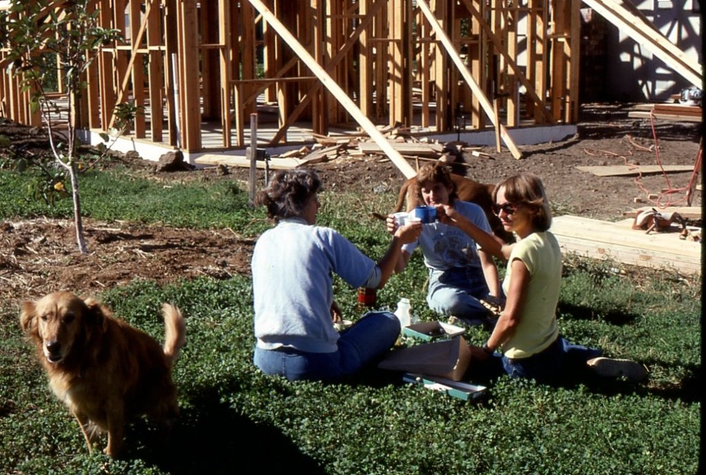 Left to right: Poppy, Valerie Anderson (owner-builder), Kristen Kolb, behind Kristen is her dog, Fay, Virginia Thigpen, contractor.