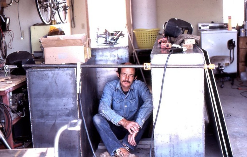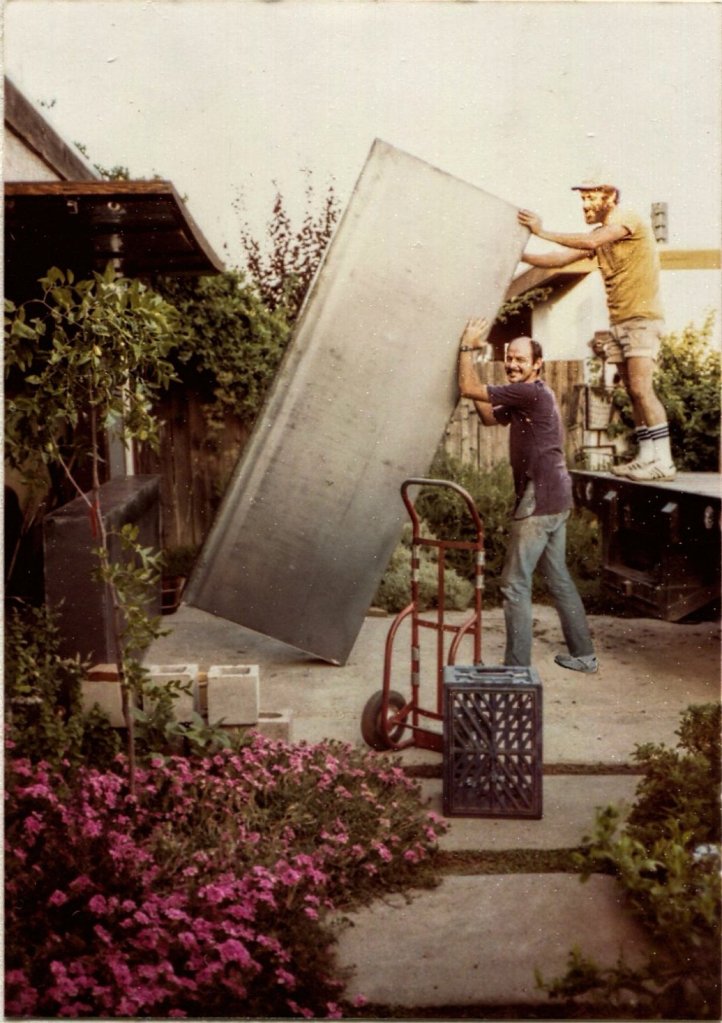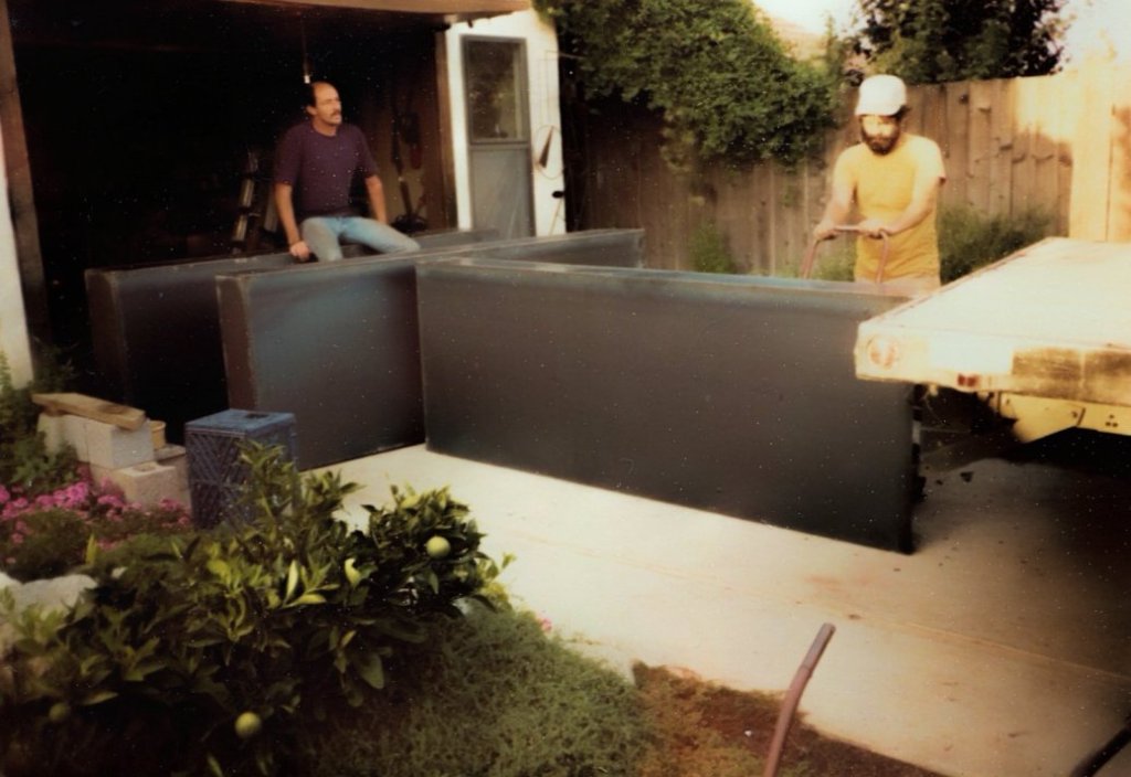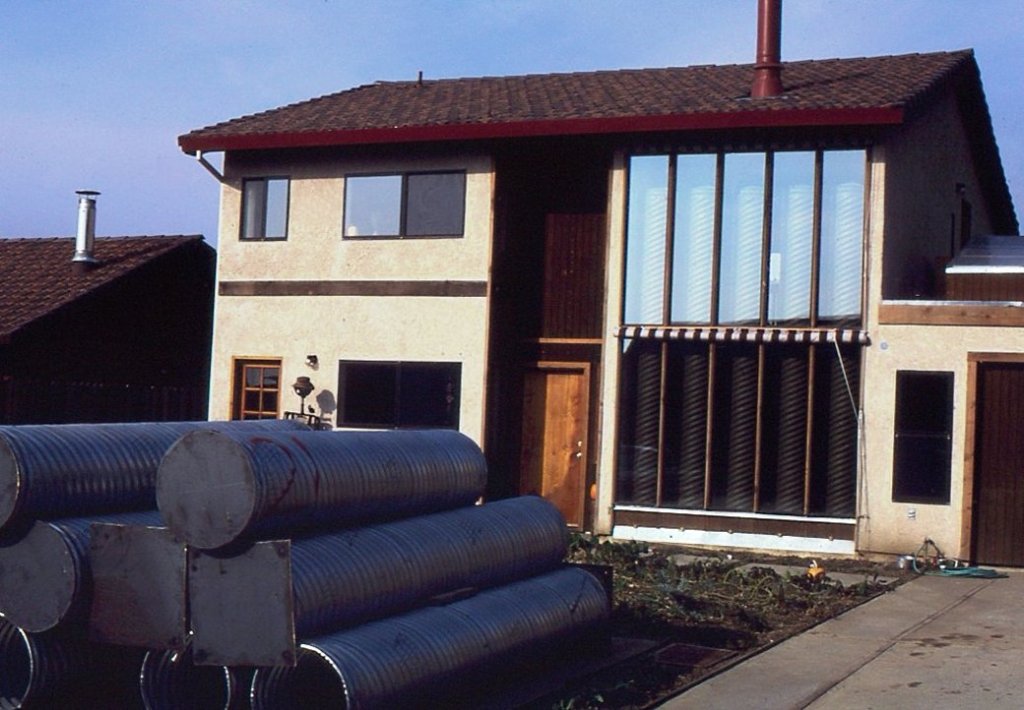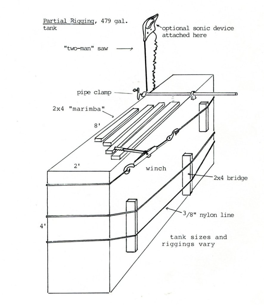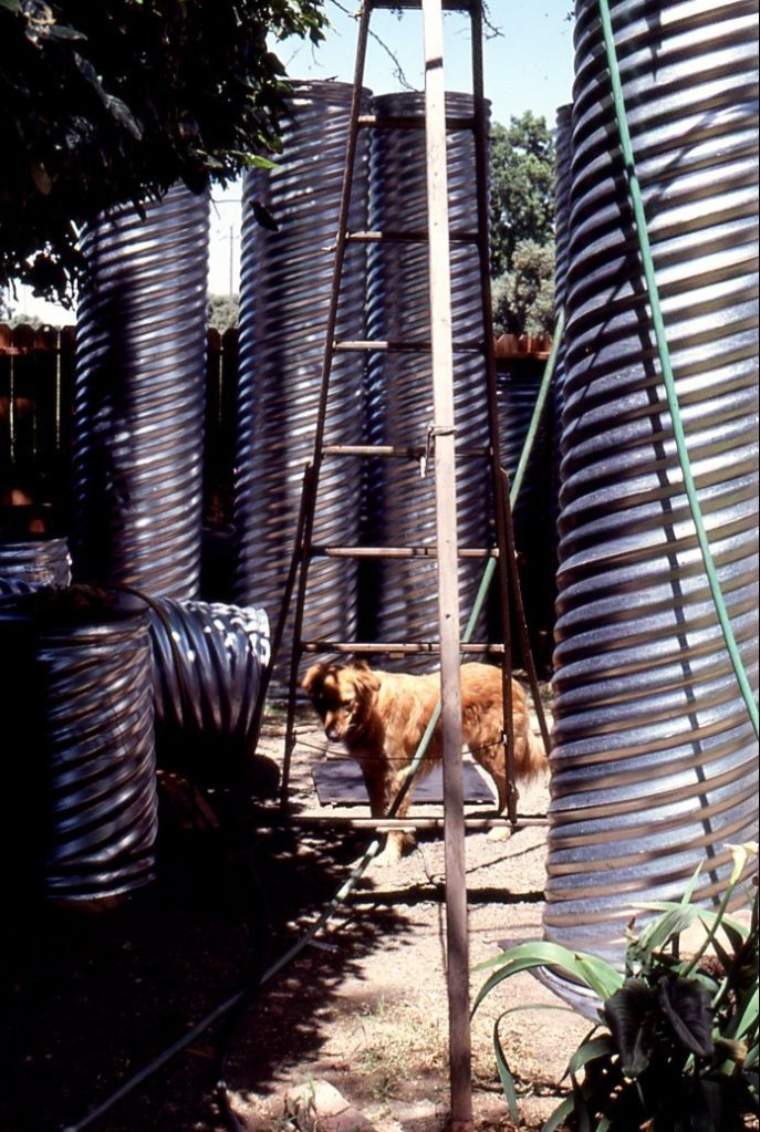 Tank Music The thermal tanks were constructed of either re-purposed, cylindrical culverts or sheets of 10 gauge mild steel. The 10 gauge tanks were rectangular, constructed to specified sizes, and were resonant, which suggested their use as temporary musical instruments. The contractor, Denny Long, and Reed collaborated. Denny ordered and delivered the flat sheets of steel to Reed, which he then welded together, then the two of them would deliver the tanks to the job sites and install them. Prior to removing the tanks from the garage shop on Westernesse, Denny and Reed would sometimes “rig” the tanks into temporary musical instruments using nylon rope for strings, tightened and tuned using a hand winch, and lengths of two-by-fours for movable bridges. Pipe clamps were used to attach the blades of handsaws vertically to the tank, handle at the top which, when gently pushed, would oscillate like inverted pendulums, serving as the rhythm section. Two or more saws would generate interesting polyrhythms. Sometimes bells were attached to the saw handles to add some sparkle to the generally low frequencies. Any other items found in the shop could join the band, such as heavy steel discs slightly propped on edge and activated to rock on the top of the tank. After rigging a tank, recording equipment would be set up and a musical invention created and recorded, the musicians mindful of the moving saw blades. The recordings were given titles based on the client’s name and the specifications of the tank, such as Corbett #18 [the 18th tank built for Mike Corbett]; January 4, 1980; Time, 6 minutes; 40.47 cubic feet; 302.73 gallons; 499.76 lbs., dry. Or, Processional/Corbett #21; January 10, 1980; (etc.). At least one of the recordings was played on an avant-garde music program on KPFA radio. A Tank Music article and recording were published in the Experimental Musical Instrument Journal (EMI), in December 1998. Now, some of these “celebrity” tanks are living in Village Homes houses, performing quietly.