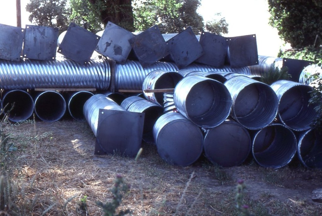 Construction Zone Reed built two steel thermal storage tanks for one of the early houses on Bucklebury which, unintentionally, led to the fabrication of many more tanks, and some tank music. The visitor parking bay in front of our house was sometimes stacked with steel culverts waiting to be turned into thermal storage tanks. Our area was still essentially a construction zone. There were fewer residents, no demand for parking, and no complaints.